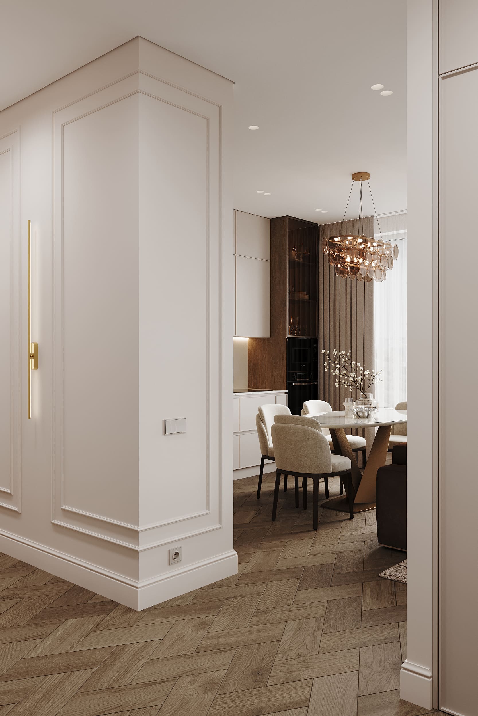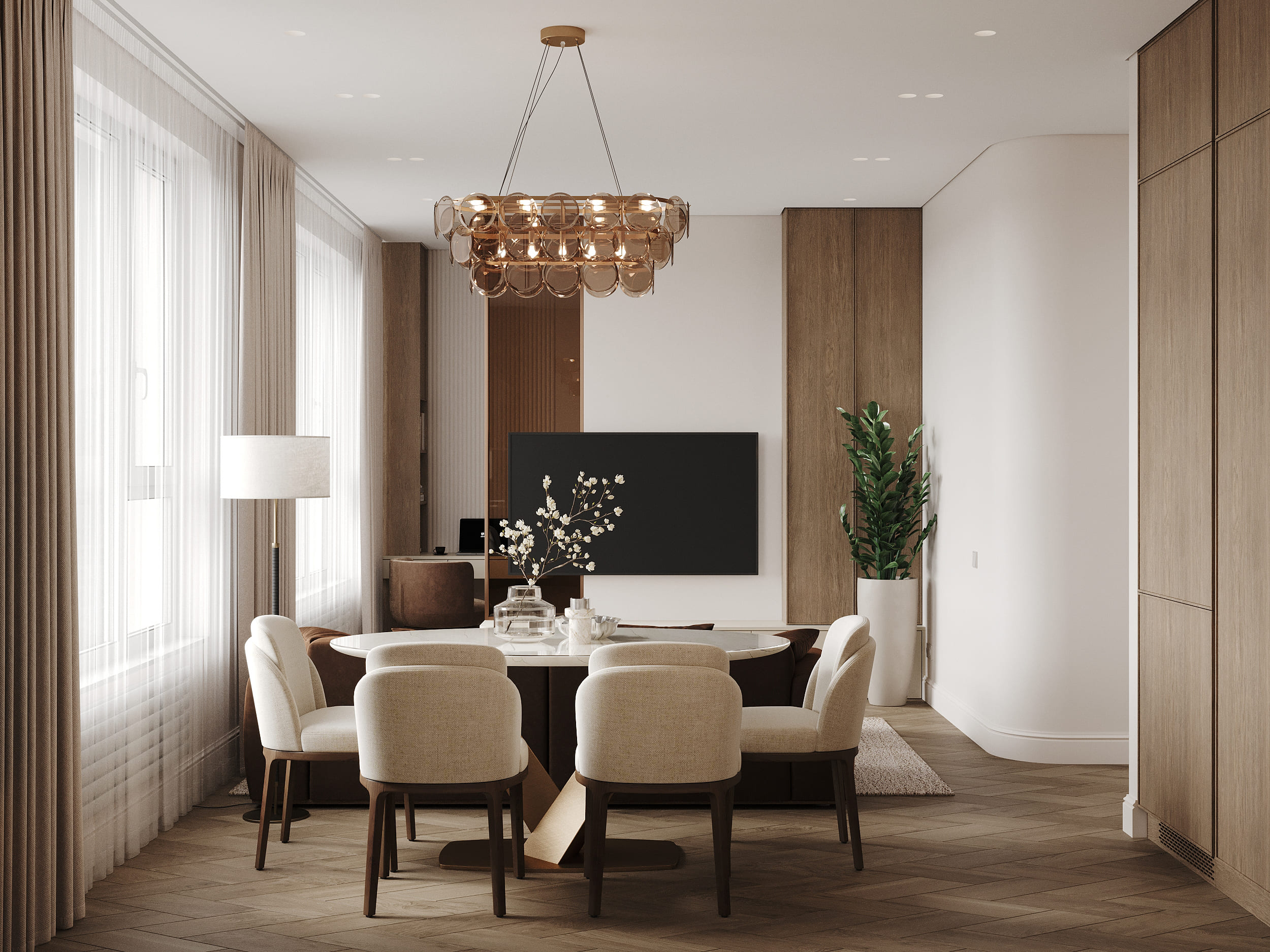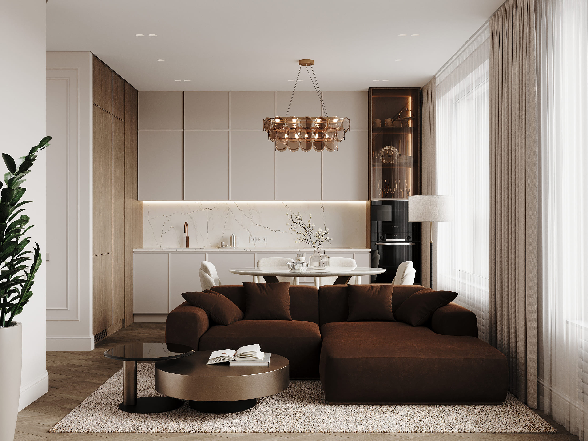 Интерьер выполнен в стиле современной классики с элементами «тихой роскоши». Тёплая, обволакивающая база дополнена глубокими шоколадными акцентами, формируя цельное и благородное пространство вне времени...