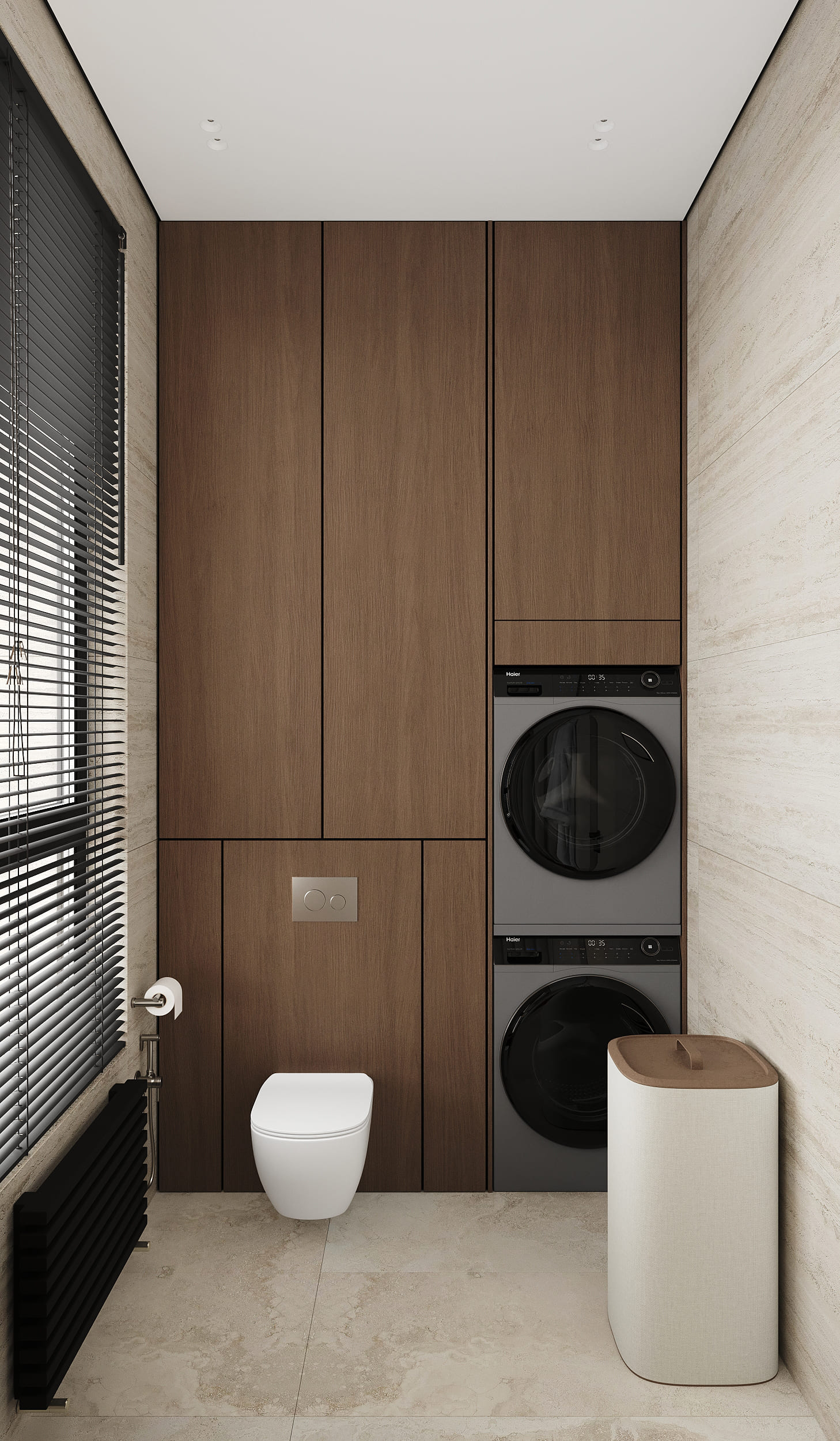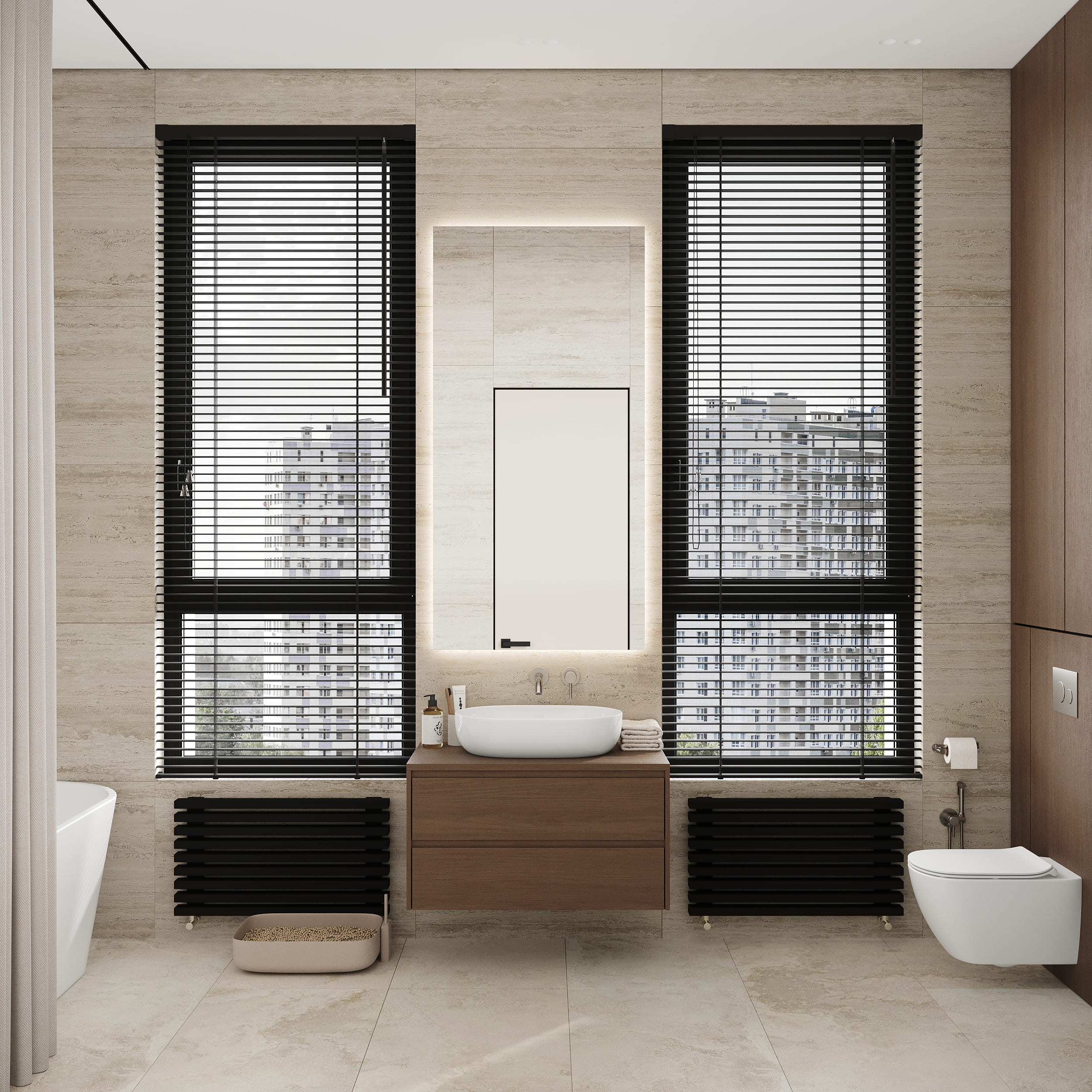 Технически сложную зону санузла с большим количеством скрытых люков удалось эстетично решить с помощью ниши, облицованной мелкоформатной плиткой: функциональный элемент стал частью дизайна и дополнительным декоративным акцентом.