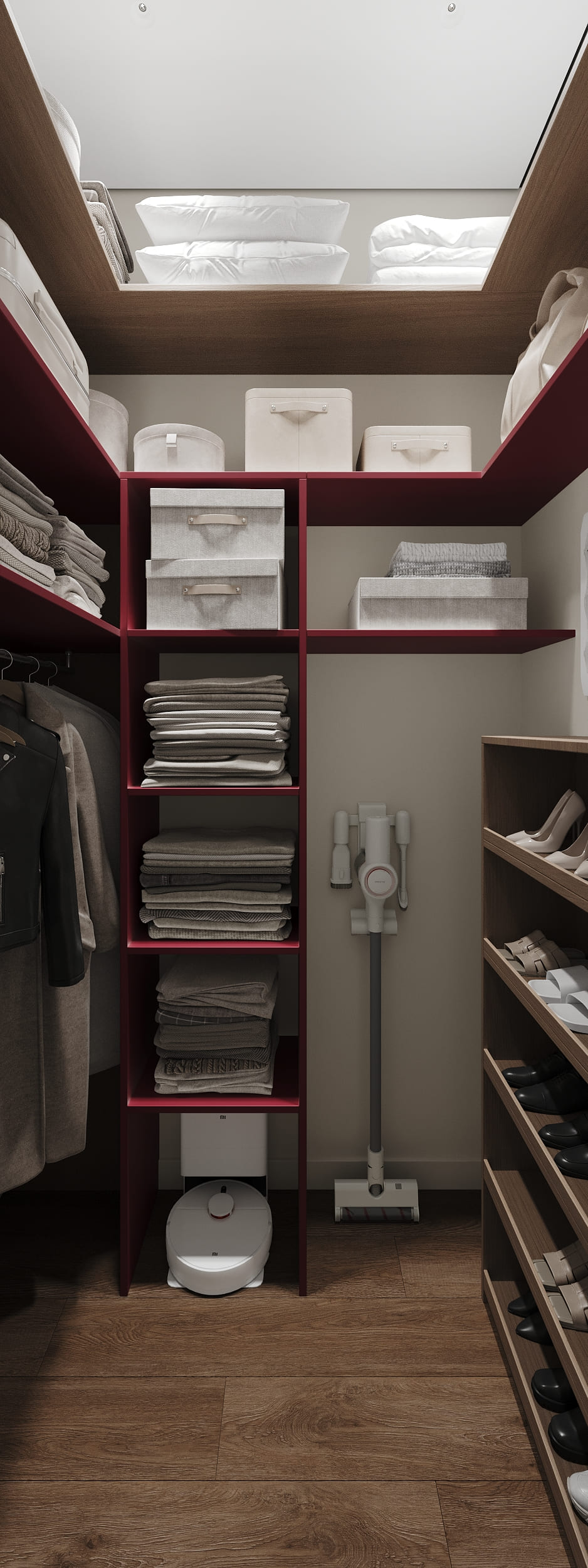 Задачей было создать функциональный и визуально цельный интерьер, который станет спокойной базой для жизни, но при этом будет иметь характер и запоминающиеся акценты. Важно было продумать большое количество систем хранения, использовать практичные и антивандальные материалы, а также эстетично интегрировать сложные технические элементы - в частности, множество инженерных лючков в зоне санузла из-за расположения квартиры на последнем этаже.